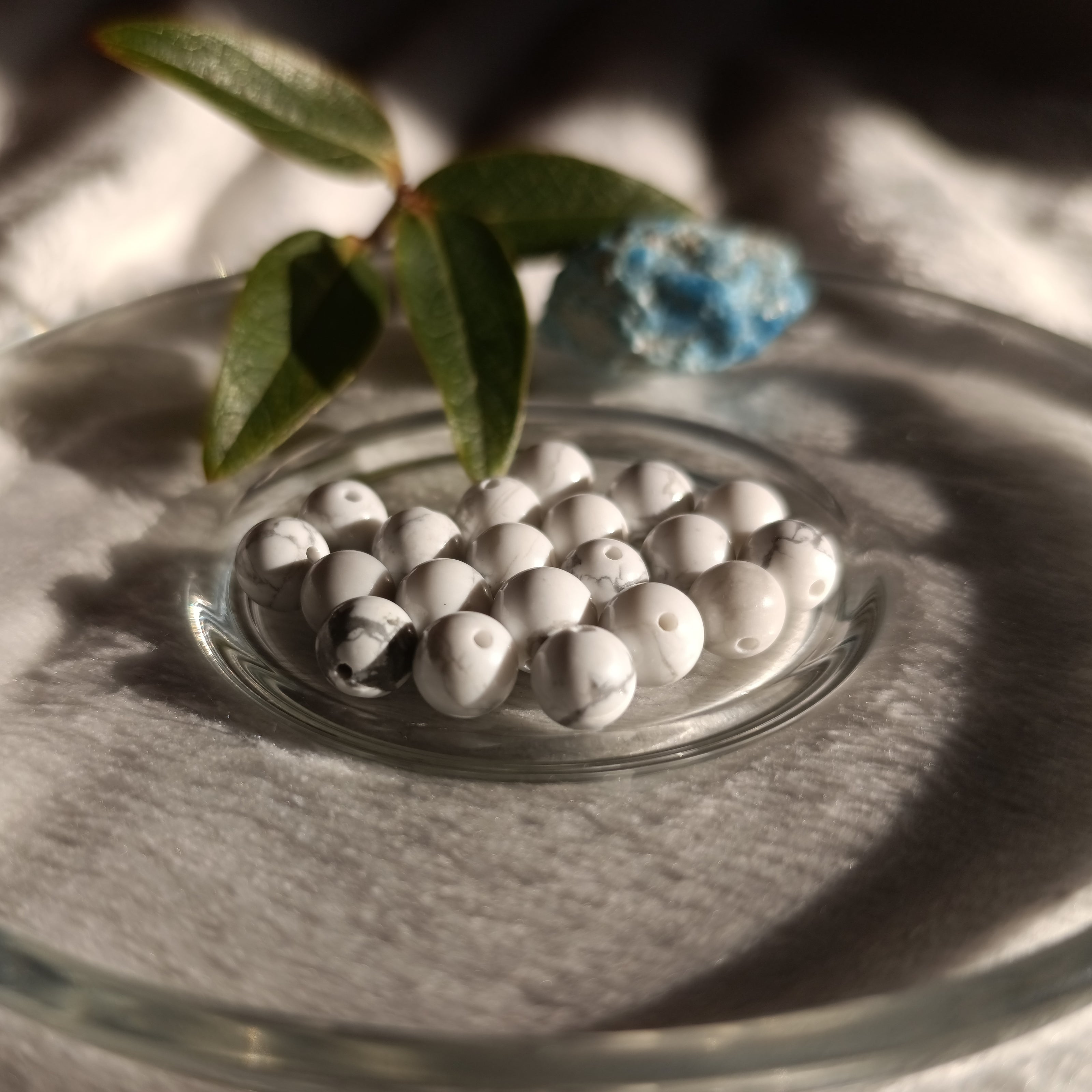 La howlite invite à la douceur et à l’insouciance, apaise le corps et l’esprit, clarifie les pensées, soutient l’équilibre intérieur et ouvre à une spiritualité sereine et ancrée.